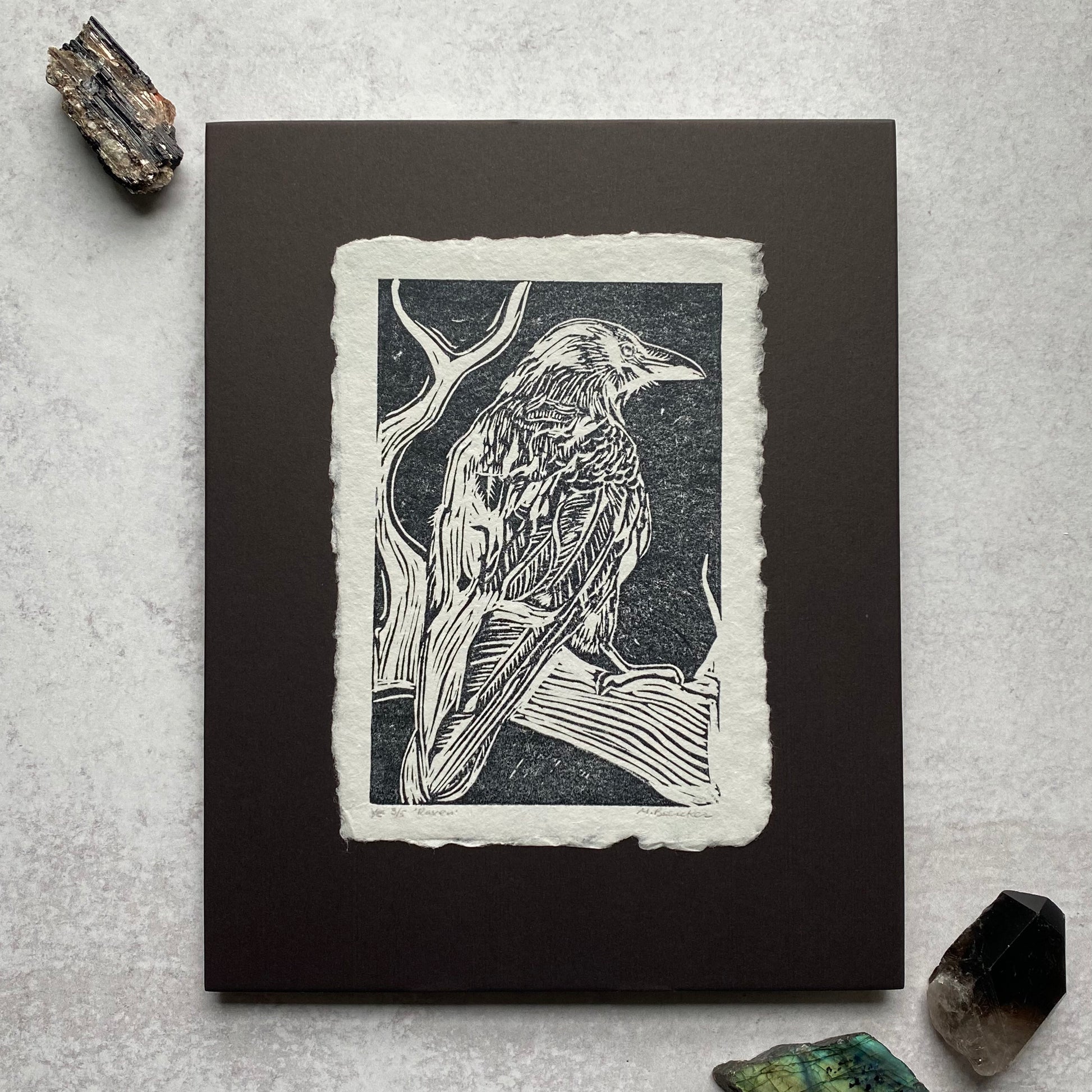 Designed by Trail Skipper Studio and inspired by a birding encounter along the rugged shores of Northern California, this 5" x 7" Raven print is hand-pressed with high-quality black oil-based etching ink on natural handmade paper. Mounted with linen hinging tape on an 8" x 10" mat board, it fits perfectly in a standard frame. The hinging tape allows easy removal for custom display on your preferred background. A one-of-a-kind piece, crafted with care and ready to enhance any space.